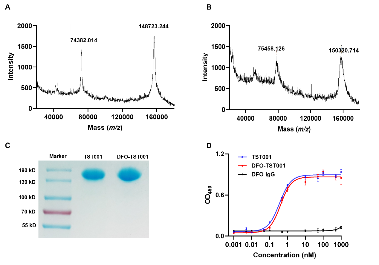 图1. TST001和DFO-TST001的分子表征。(A)TST001 的MALDI-TOF-MS分析。(B) DFO-TST001的MALDI-TOF-MS分析。(C)TST001和DFO-TST001的SDS-PAGE表征(D)通过ELISA评估TST001和DFO-TST001与人CLDN18.2蛋白的结合力。