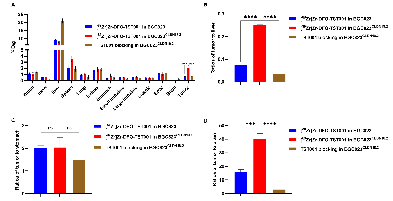 图6.三种不同肿瘤模型中的生物分布结果(A) [89Zr]Zr-DFO-TST001注射后48 h在三种不同肿瘤模型的生物分布(B) 肿瘤/肝脏的%ID/g比值 (C) 肿瘤/胃的%ID/g比值(D)肿瘤/脑的%ID/g比值(****,P < 0.001; ****,P < 0.0001; ns,无显著性差异)