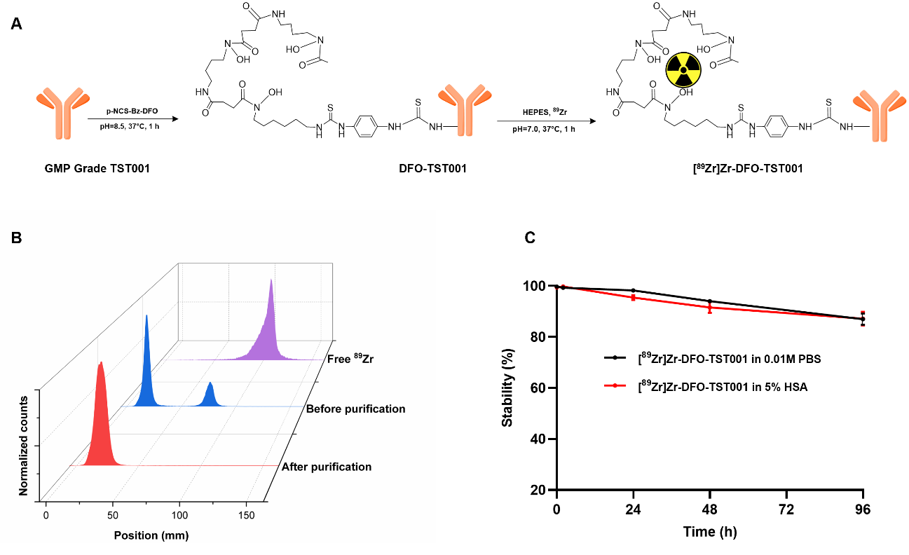 图2. [89Zr]Zr-DFO-TST001的合成、质量控制和体外稳定性评价(A) [89Zr]Zr-DFO-TST001的合成和放射性标记。(B)纯化前后[89Zr]Zr-DFO-TST001的Radio-TLC结果。(C)[89Zr]Zr-DFO-TST001的体外稳定性分析