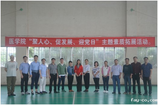 为迎接中国共产党成立96周年和党的十九大胜利召开,进一步引导全院党员干部增强政治意识、大局意识、核心意识、看齐意识,扎实推进“两学一做”学习教育常态化制度化,根据学校组织部《关于开展“七·一”前后重点工作的通知》贵大党组通〔2017〕18号文件要求,结合学院实际,医学院党委于2017年6月29日在贵州大学北校区体育馆副馆举行“不忘入党初心、重温入党誓词”主题教育活动暨“聚人心、促发展、迎党日”主题素质拓展活动,医学院党委书记陈莉琼同志带领全院教职工党员、学生党员以及教职工参加了此次活动。